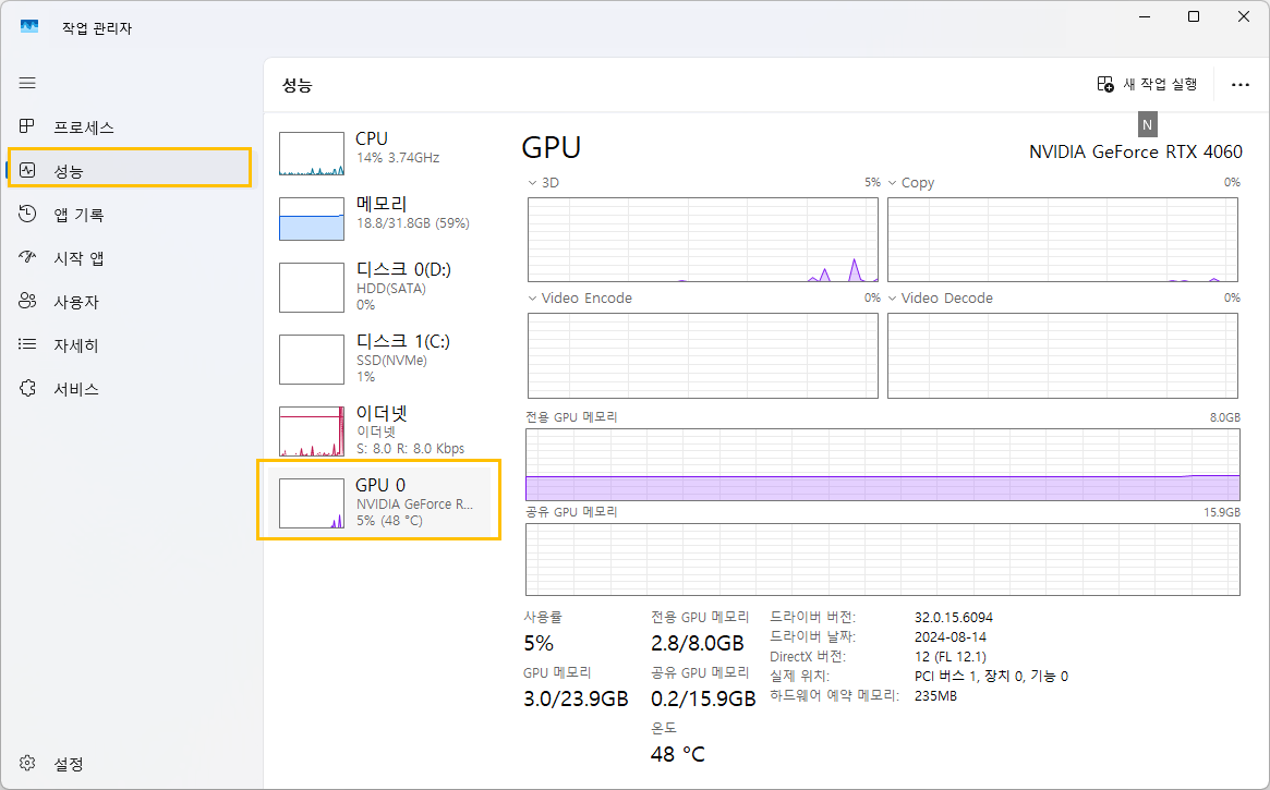 윈도우즈 > 작업관리자 > 성능 탭에서 GPU 유무와 GPU 메모리 스펙을 체크해두도록 합니다.