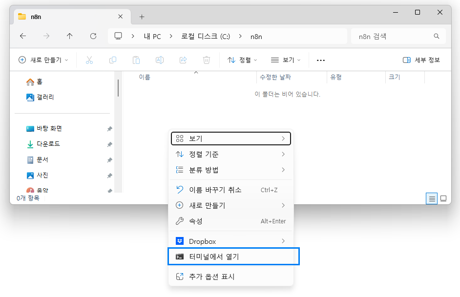 저는 일단, 공간이 남는 C드라이브에 n8n 폴더를 하나 생성했습니다.