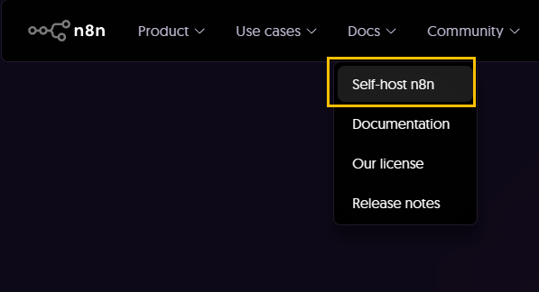 상단의 Docs 메뉴 아래의 Self-host n8b 메뉴를 클릭해서 들어가도록 합니다.
