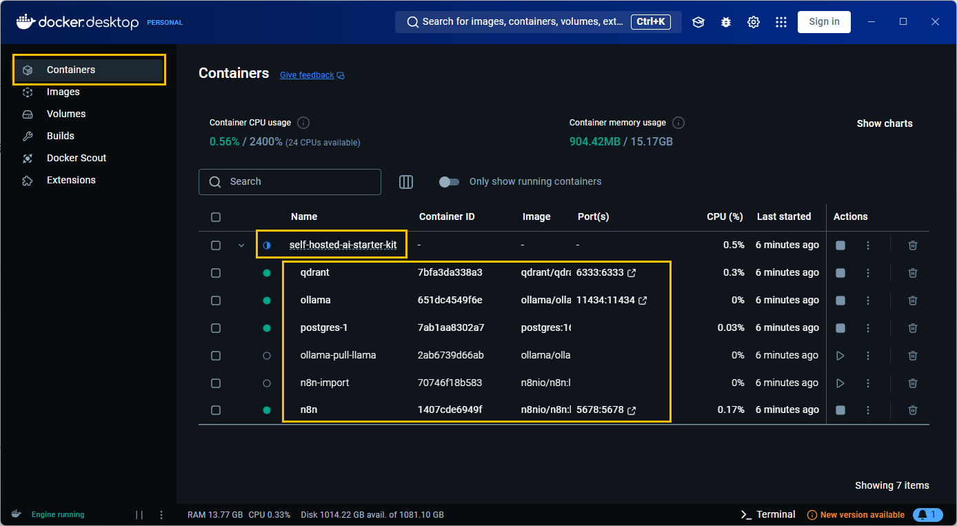 Containers 메뉴를 클릭해보면, self-hosted-ai-starter-kit가 만들어져 있을 것입니다. 폴더를 펼쳐보면 qdrant, ollama, postgres-1, n8n 등이 설치되어 있을 것입니다.