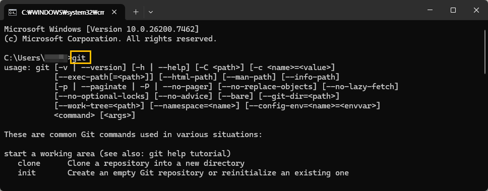 Git 설치가 잘 되었다면, 아래 이미지처럼 git 관련 도움말이 표시될 것입니다.