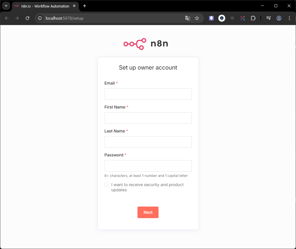 브라우저에 아래와 같이 n8n의 로그인 창이 뜨면 일단 성공입니다.
