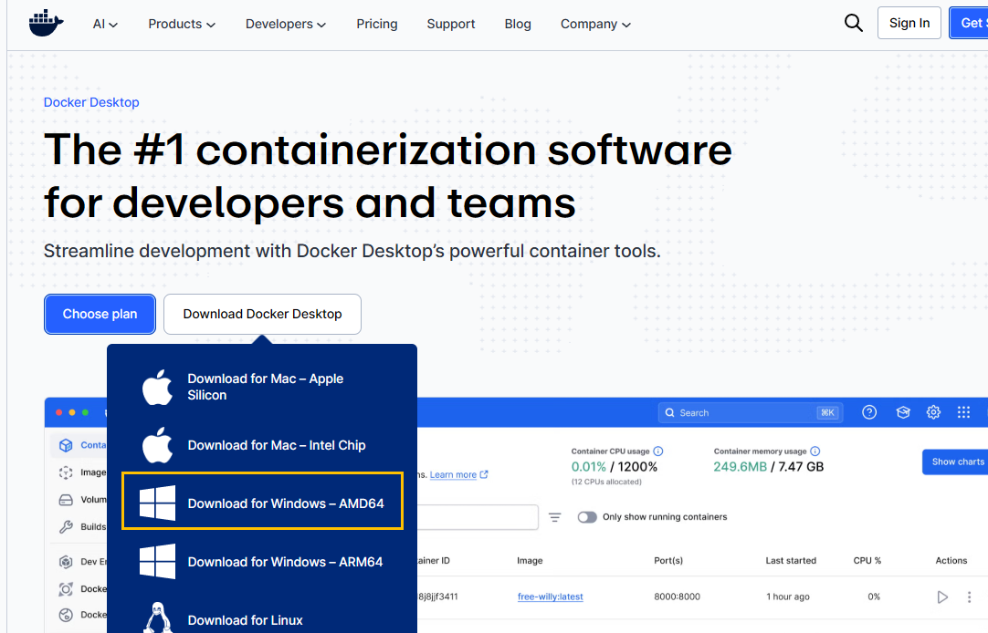 도커는 https://www.docker.com/ 에서 다운로드 받을 수 있습니다.