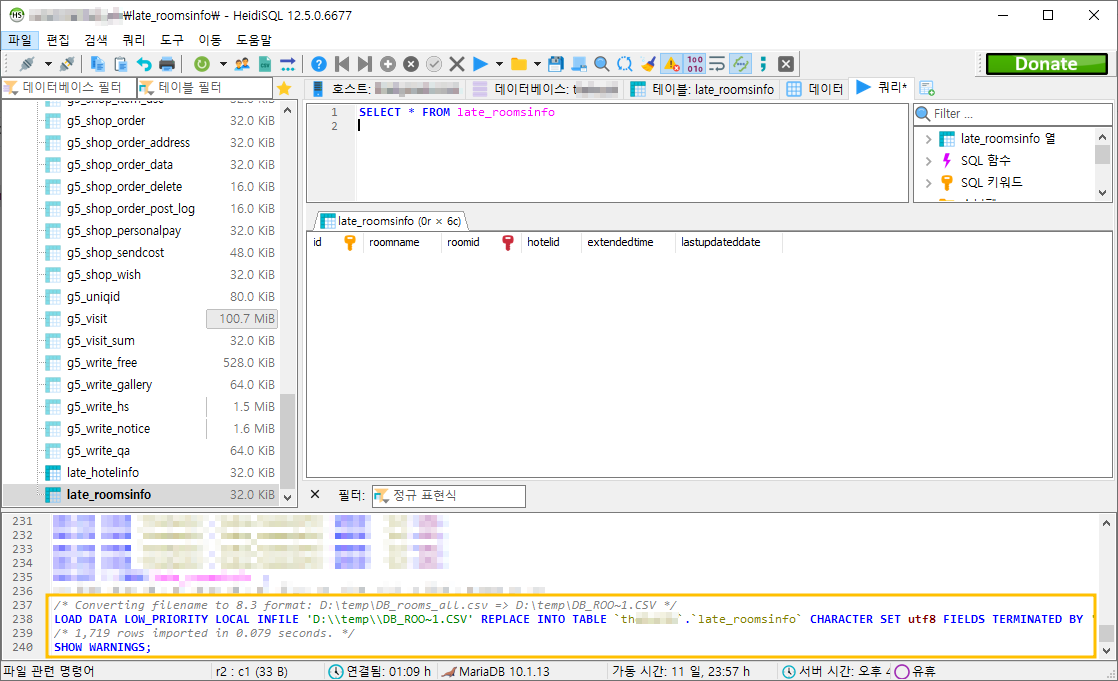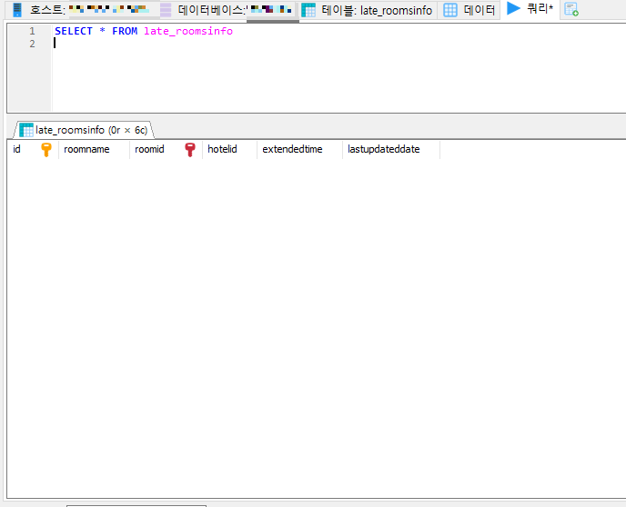 우선은 late_roomsinfo 테이블 생성해서 가지고 놀다, 테스트 데이터를 모두 삭제한 상태입니다.