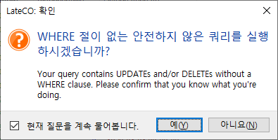 조건절(WHERE)이 없으므로, 테이블 전체에 적용이 되기 때문에 위험하다고 팝업이 나옵니다.