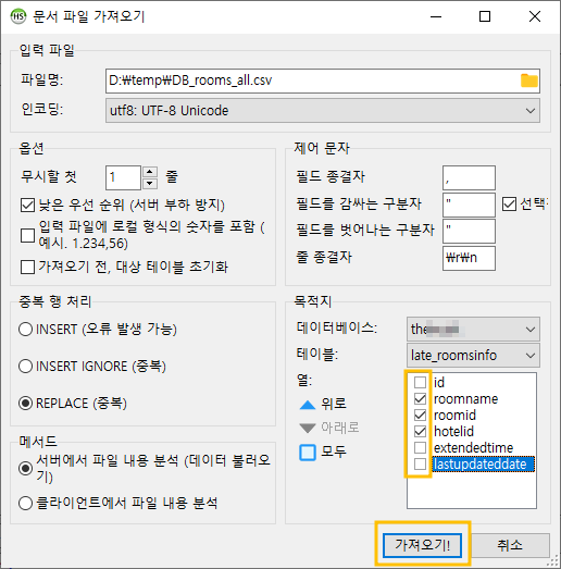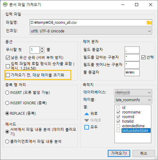 '가져오기 전, 대상 테이블 초기화' 옵션이 바로 그것입니다.