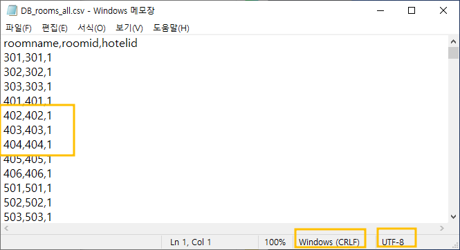 메모장에서 열어보면, 데이터는 콤마(,)로 구분되어 있고, Windows 환경에서 CRLF는 행종결자가 \r\n에 해당합니다. 인코딩은 UTF-8. 대충 한번 훑어보면면 쉽게 구분할 수 있겠습니다.