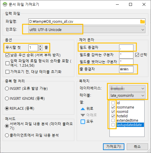 필드 종결자와, 줄 종결자라는 이름이 참 독특하게 느껴지는데, CSV 파일이 콤마(,)로 구분되어 있으므로 콤마(,)를 선택해줍니다. 줄 종결자는 \r\n을 선택해줬는데, 이 정보는 CSV 파일을 메모장에 불러와보면 쉽게 알 수 있습니다.