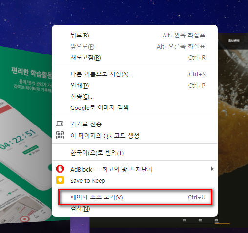 마우스 우측 버튼을 누르고, 팝업 메뉴에서 페이지 소스 보기를 선택해줍니다.