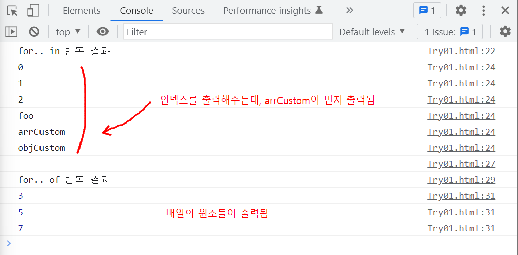 위 예제로 살펴보면, iterable이라는 배열을 for.. in으로 반복하는 경우, 눈에 보이는 배열의 원소 뿐만 아니라, 눈에 보이지 않는 프로토타입 속성의 인덱스까지 모두 돌며 반복하는 것을 알 수 있습니다. 게다가 objCustom을 먼저 정의해주었지만, arrCustom이 먼저 출력되기도 합니다.(그래서 인덱싱의 순서를 보장할 수 없다는 의미!)