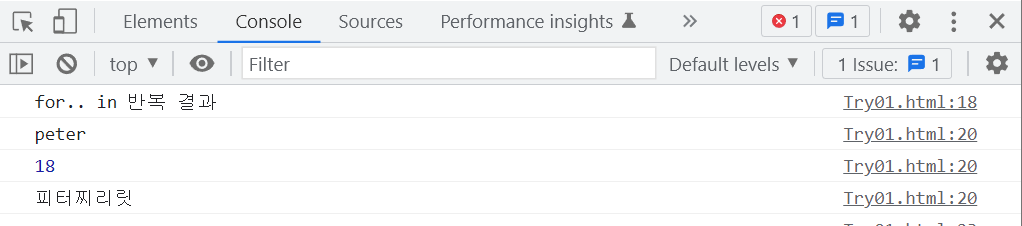 오브젝트 자료형에서의 반복은 역시 인덱싱 순서가 중요하지 않은 for.. in 문을 사용하면 편리합니다.
