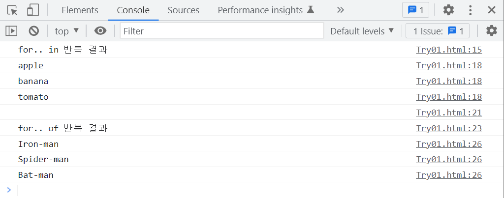 for.. in의 경우에는 key값에 대응하는 value는 이렇게 간단하게 출력할 수 있겠죠?