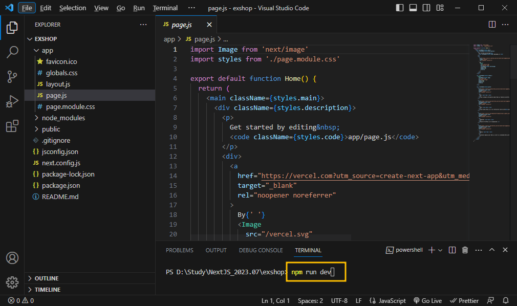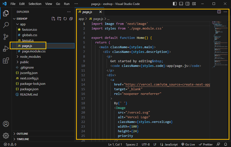 app 폴더 아래에 있는 page.js가 바로 index 파일입니다. 클릭하면 우측에 소스가 열리겠죠?