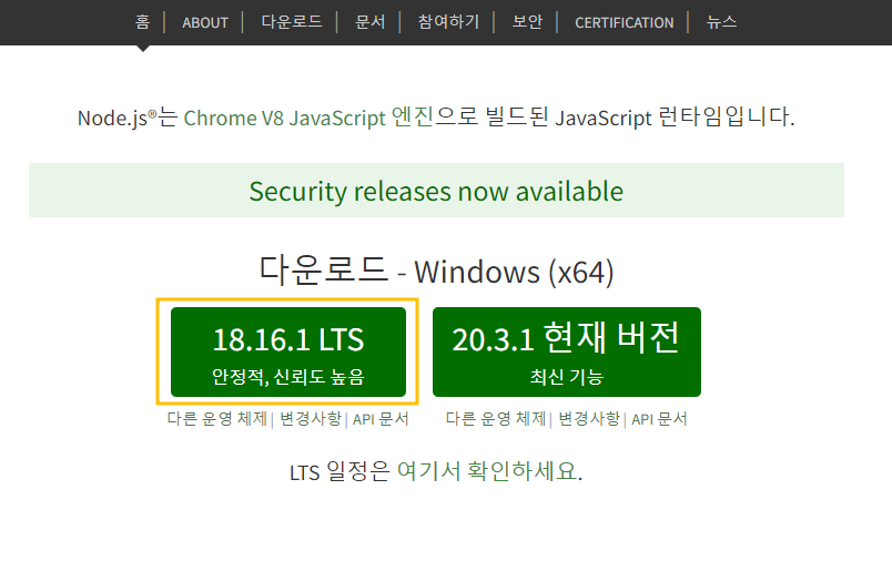 저는 18.16.1 LTS 버전으로 설치해주었습니다.