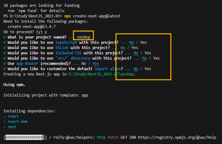그 사이 버전이 변경되었는지, 3개월 전에 Next.js를 설치할 때와는 질문들이 다르군요.