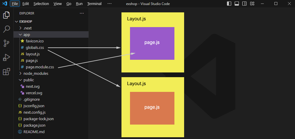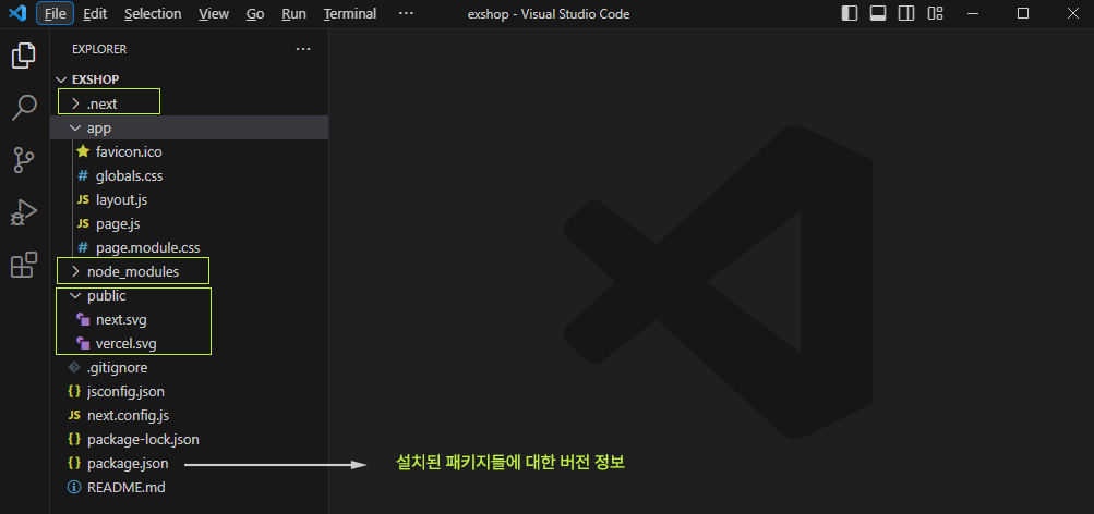 .next 폴더에는 Next.js 구동에 필요한 파일들, node_modules에는 역시 Next.js 구동에 필요한 노드.js 모듈들이 있겠죠? 우리는 Next.js 학습이 목적이니 처음부터 신경쓰지 않아도 됩니다. 한편 public 폴더에는 주로 이미지 파일들이 위치하게 됩니다.