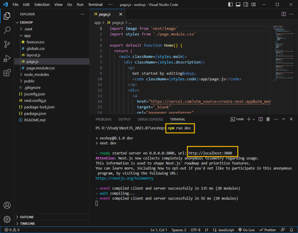 Next.js는 프레임워크 이기 때문에, 실행을 위해서는 소스코드를 컴파일링 해주는 과정이 필요합니다. 잘 생각해보시면 온통 js 파일들만 만들었으니, 이 파일들을 웹 브라우저가 이해할 수 있는 HTML 파일로 변환을 시켜줘야 하겠죠?