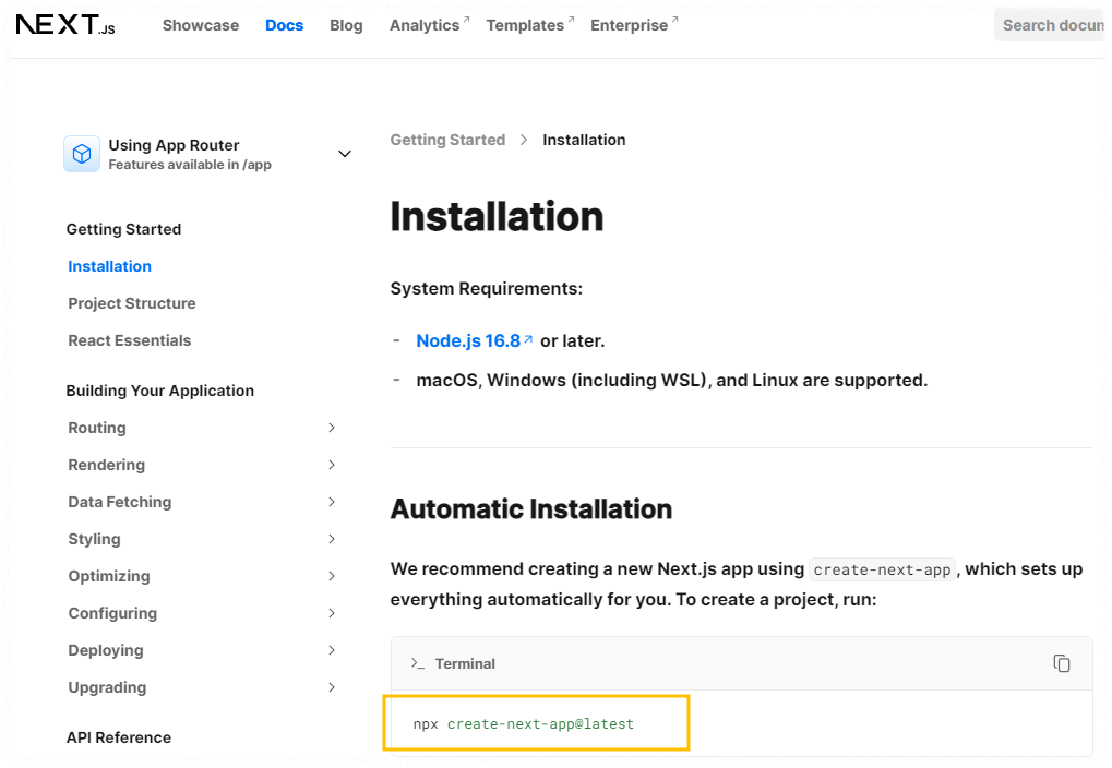 이 설치(Installation) 과정은 Next.js 공식 페이지의 Getting Started에도 소개되어 있는 내용입니다.