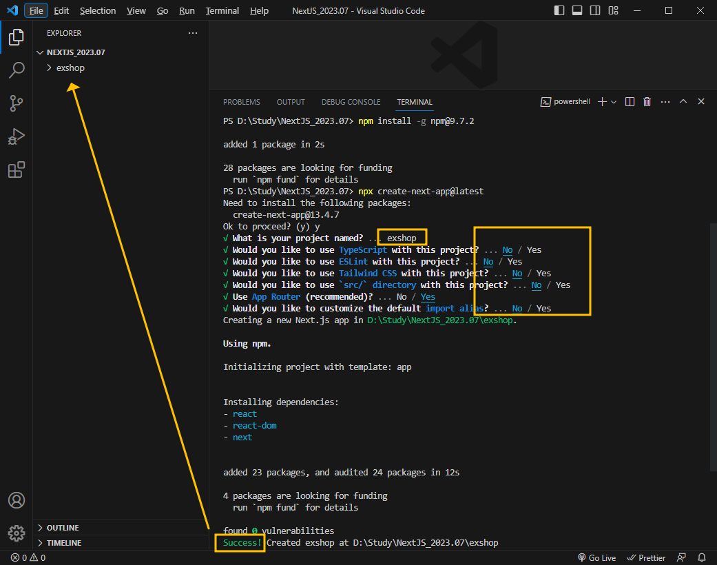 Success! 표시가 나오고, 앞에서 지정한 exshop이라는 폴더가 만들어졌으니, 제대로 된 것 같습니다.