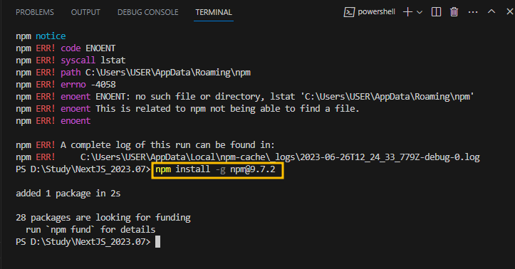 어랏.. 에러가 눈에 들어옵니다. 대충 살펴보니, npm 이 업데이트 되었다는 안내 같군요. 까라면 까야죠.