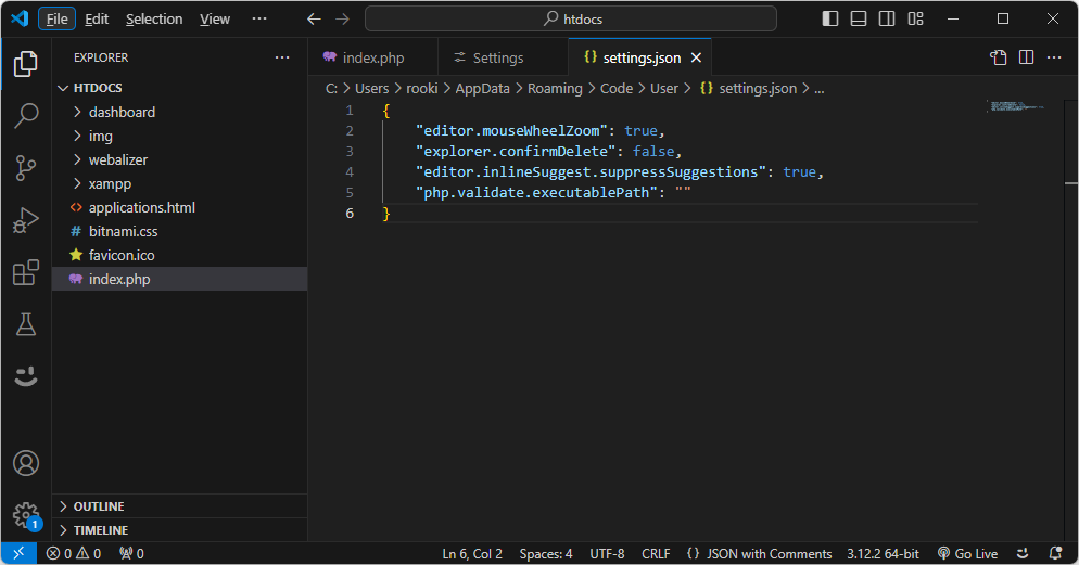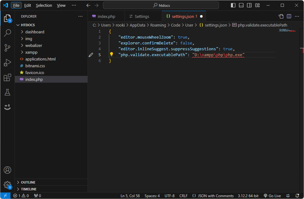 json 파일이 열리면, php.validate.executablePath의 값이 비어 있는 것이 확인됩니다.