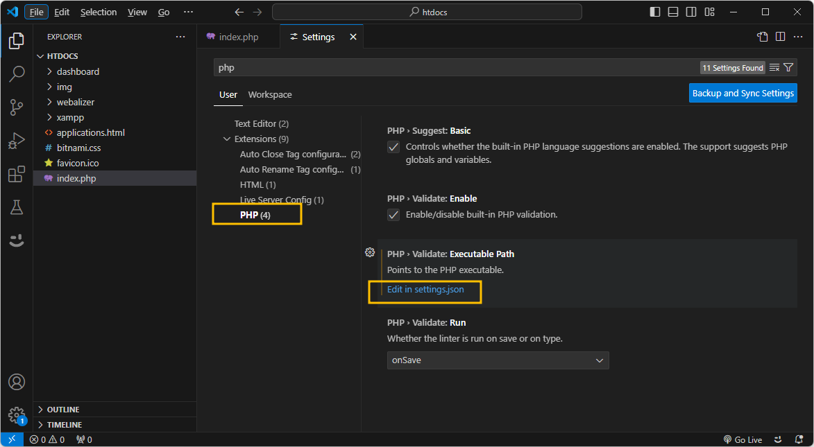 json 파일이 열리면, php.validate.executablePath의 값이 비어 있는 것이 확인됩니다.