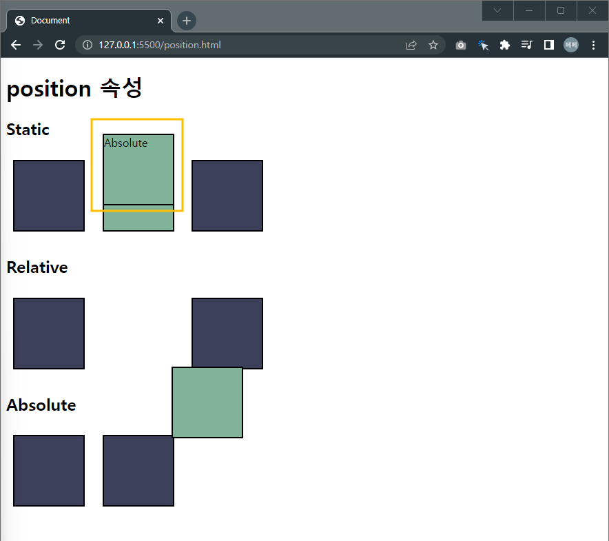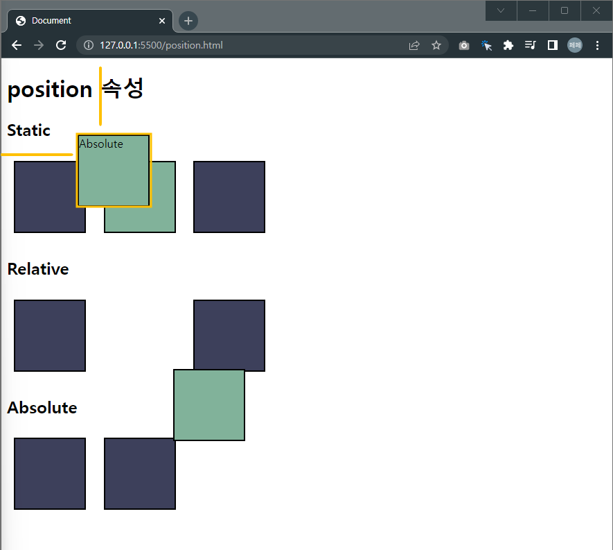 Live Server를 실행해보면, 아래와 같은 형태에서 position에 대한 속성들을 살펴보기로 합니다.