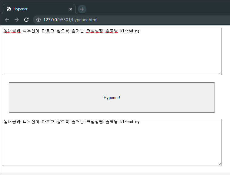 상단 영역에 문장을 붙여 넣기하고, Hypener 버튼을 클릭하면 공백을 하이픈(-)으로 바꿔쳐줍니다.