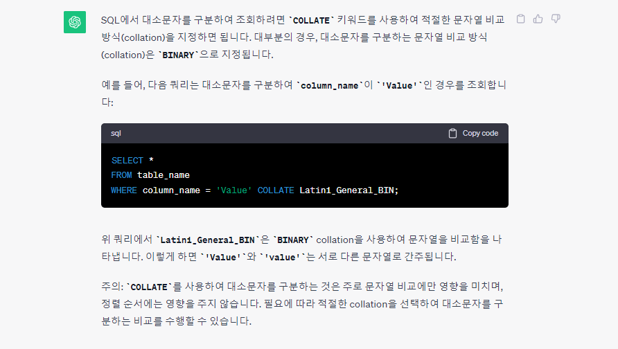 이번에도 꾸역 꾸역 코드에 손을 대보고 있는데, 결과 값이 간헐적으로 이상하게 나오길래 찬찬히 확인을 해보니, SQL은 조회하는 값에 대해서 대소문자를 구분하지 않는다는 사실을 새롭게 알게 되었습니다.