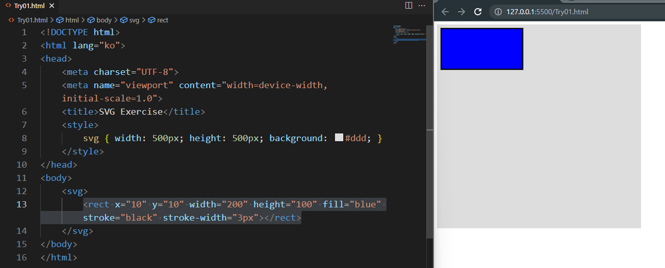 <rect x="10" y="10" width="200" height="100" fill="blue" stroke="black" stroke-width="3px"></rect>