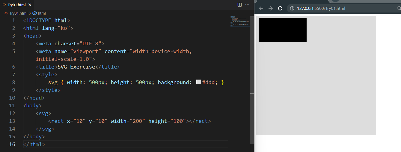 가로 200, 세로 100인 검정색 사각형이 그려집니다.