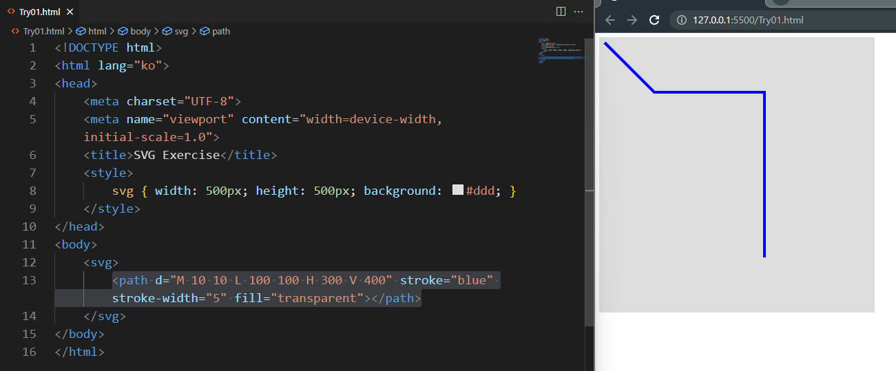 <path d="M 10 10 L 100 100 H 300 V 400" stroke="blue" stroke-width="5" fill="transparent"></path>