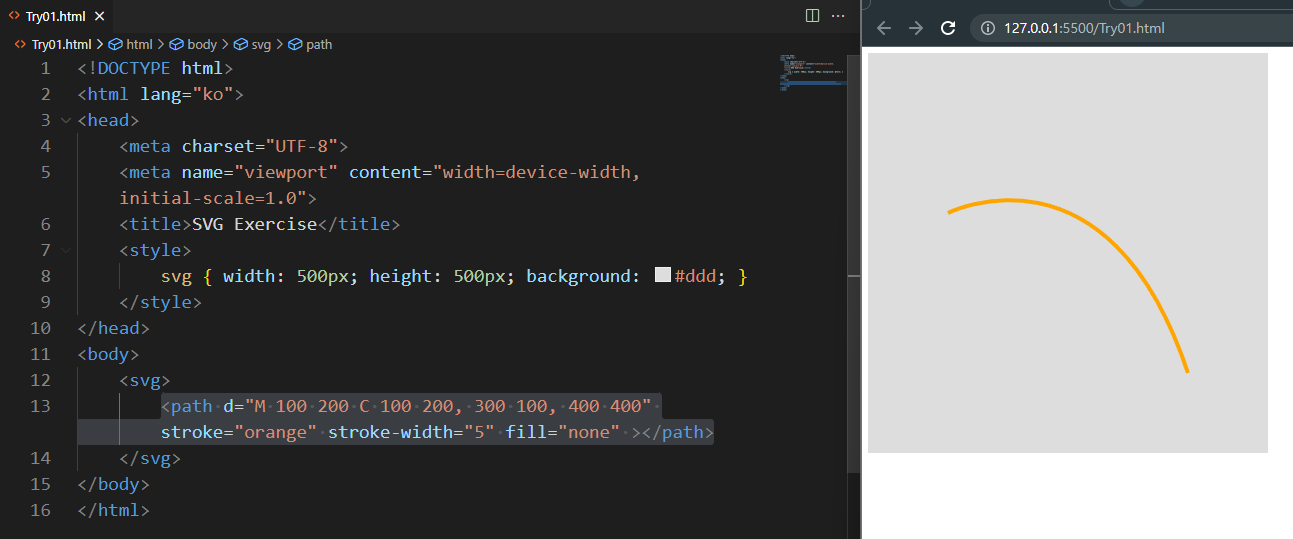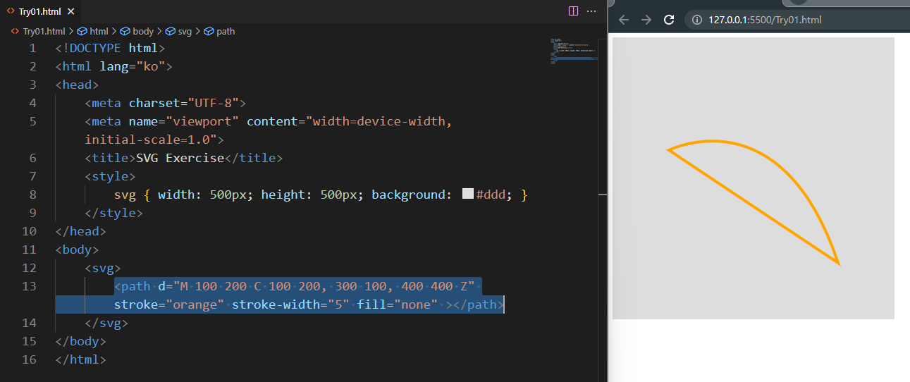 <path d="M 100 200 C 100 200, 300 100, 400 400" stroke="orange" stroke-width="5" fill="none" ></path>