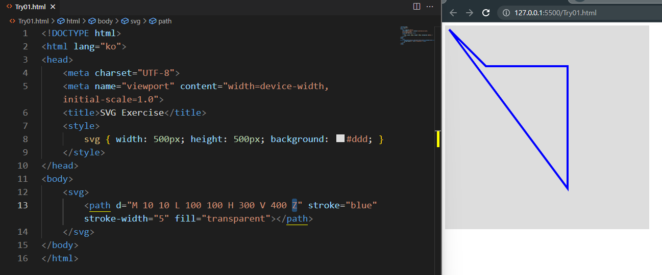 <path d="M 10 10 L 100 100 H 300 V 400 Z" stroke="blue" stroke-width="5" fill="transparent"></path>
