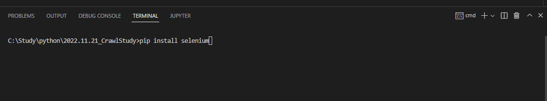 VSC 터미널에서 pip install selenium 명령을 통해 실행.