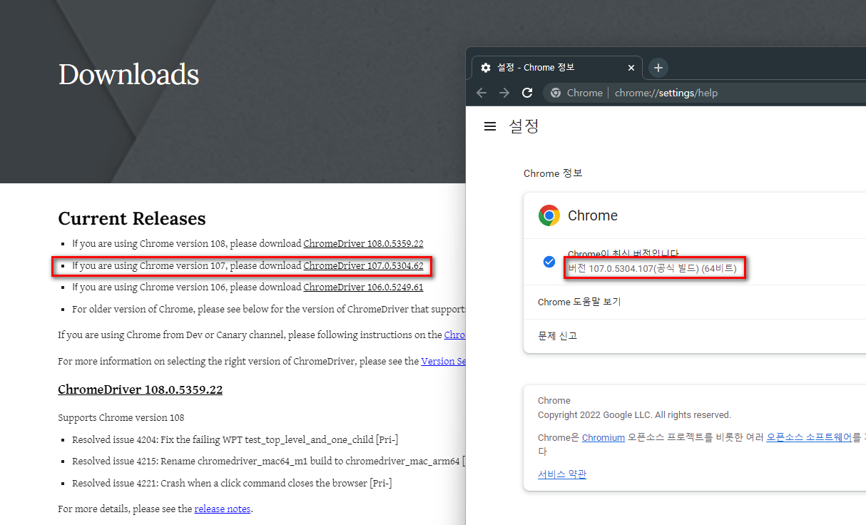 Current Releases If you are using Chrome version 108, please download ChromeDriver 108.0.5359.22 If you are using Chrome version 107, please download ChromeDriver 107.0.5304.62 If you are using Chrome version 106, please download ChromeDriver 106.0.5249.61