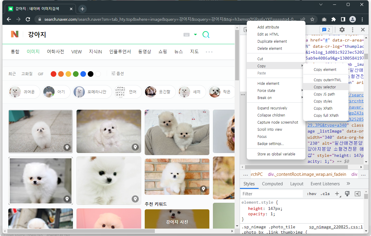 아무튼, 복사한 셀렉터를 원래 코드에 붙여 넣어 봅니다.