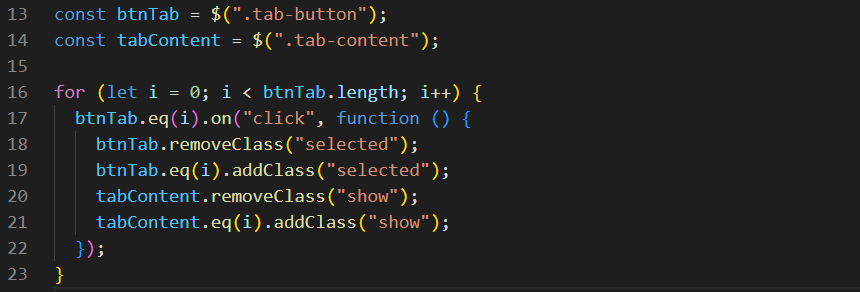 그리고 click이 발생하면 반복문을 돌리면서, .selected와 .show 클래스를 싹~ 떼어준 후 선택된 탭 메뉴에만 해당 클래스를 붙일 수 있도록 했습니다.